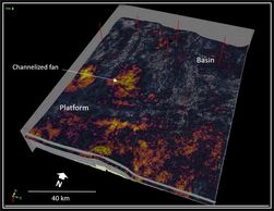 High Resolution Spectral Decomposition image of a carbonate platform showing shelf margin and basin location
