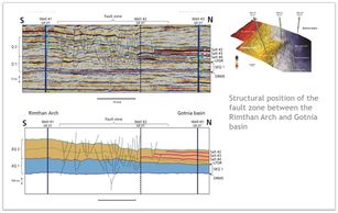 Seismic section shows 3 key salt bed seals onlapping older beds within a basin. Note major fault fractures and their location at basin margin